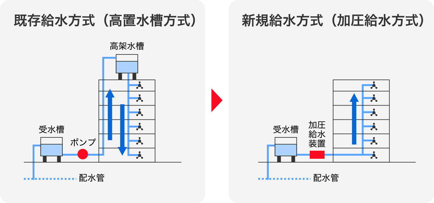 給水方式変更工事は、各部屋への給水方法を変更するための工事です。近年、受水槽や高架水槽を使用せずに給水する方式へ変更するケースが増えております。屋上の水槽を撤去することで、建物の負担を軽減できます。