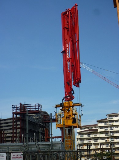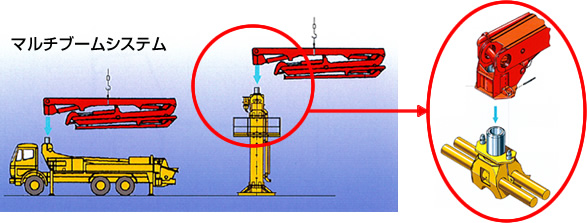 コンクリートポンプ車搭載のブーム部分が、建設現場内に設置した支柱に接続し、ブームワークにより生コンクリートを打設するコンクリート圧送技術です。