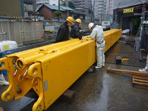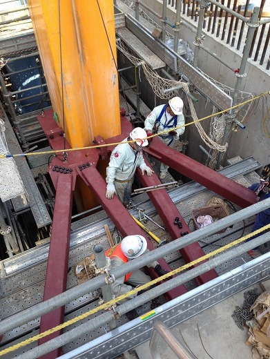 大型の雨水ポンプ所の構築工事では階高が高いためフロア間での壁・柱が多くブームワークが施工効率を格段にアップします。