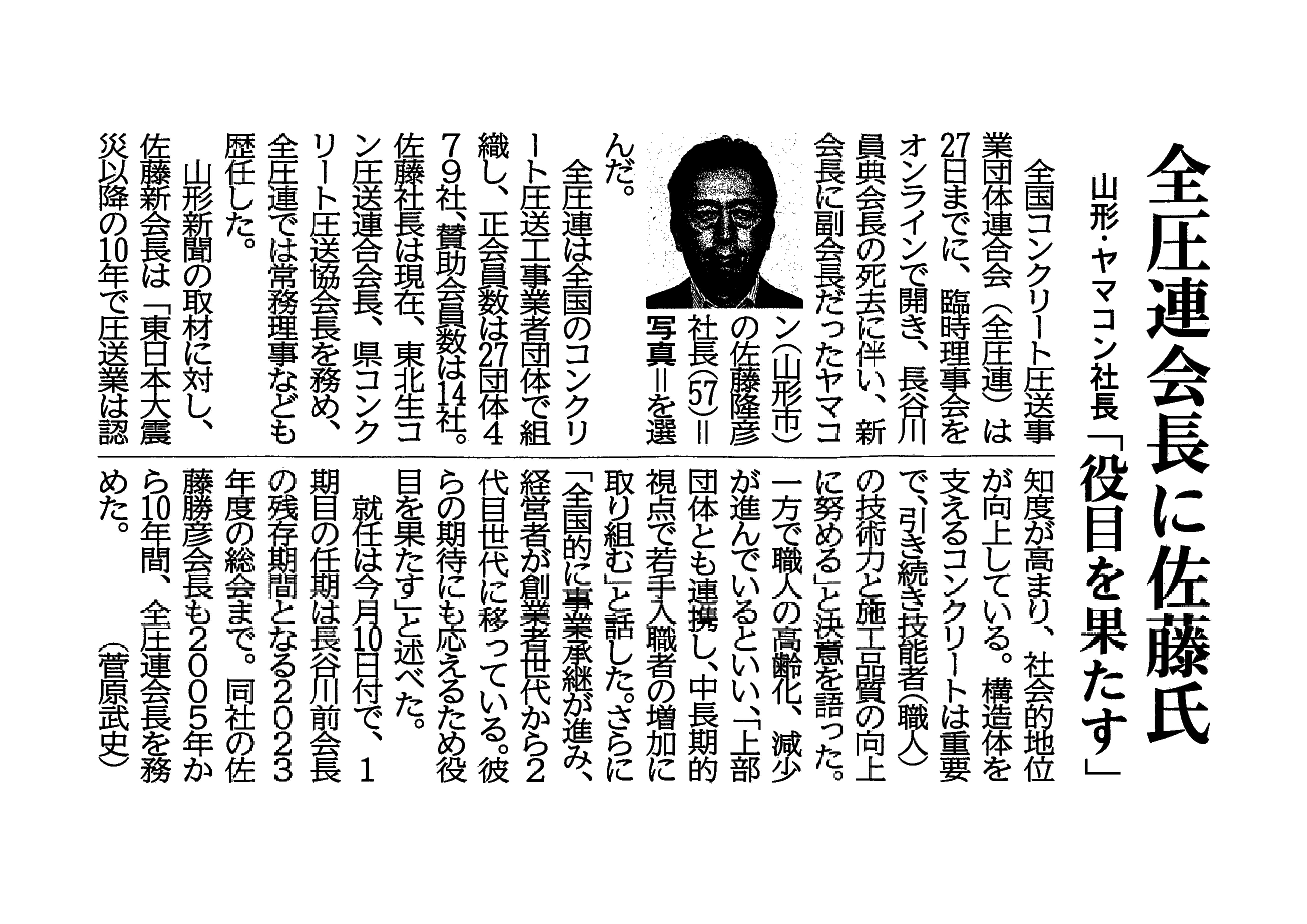 全国生コンクリート圧送事業団体連合会「会長就任」ー山形新聞掲載ー