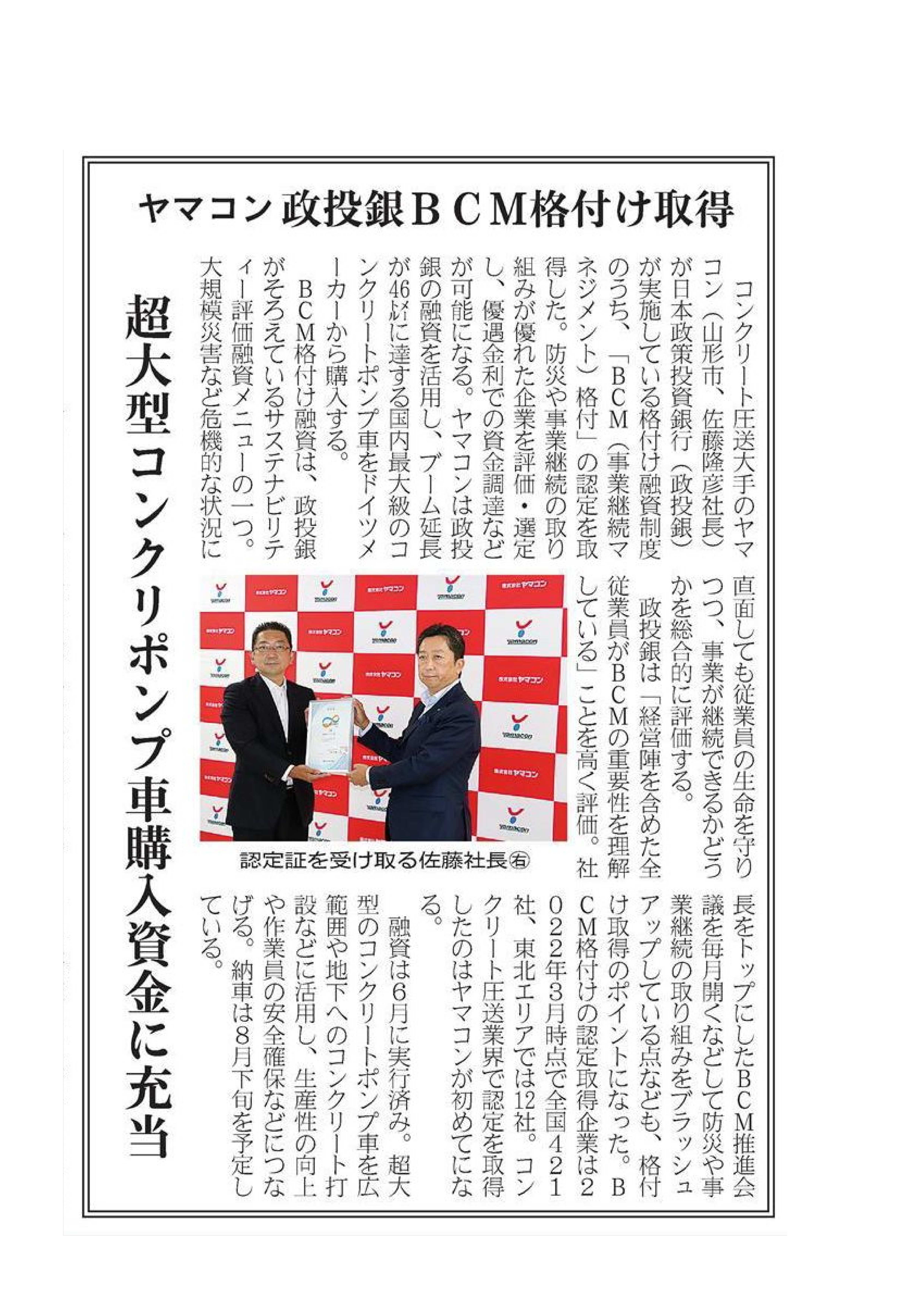 ヤマコン政投銀BCM格付取得ー建設工業新聞掲載ー
