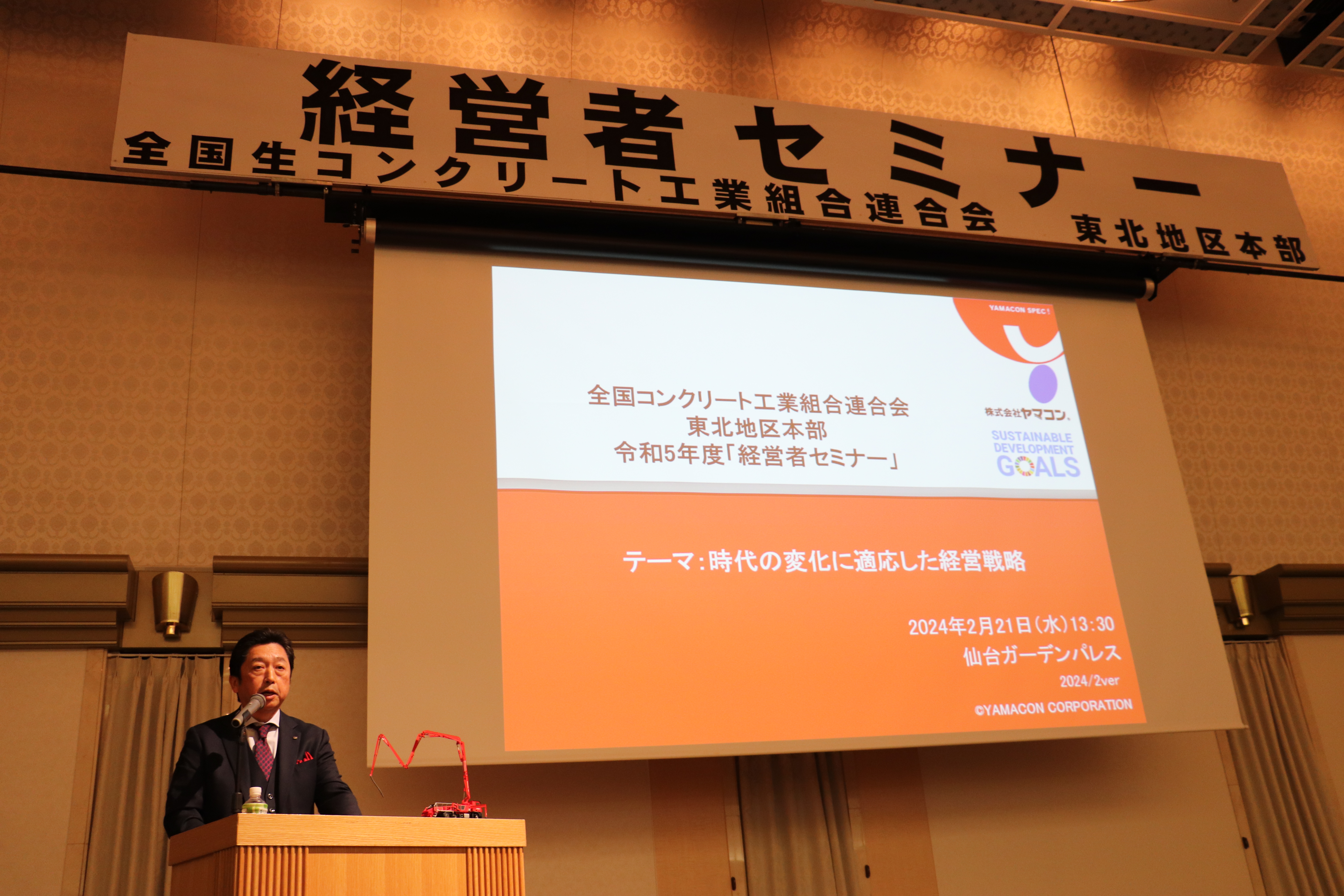 令和6年2月21日(木)仙台ガーデンパレスにおいて、全国生コンクリート工業組合連合会 東北地区本部で主催された「令和5年度経営者セミナー」で「時代の変化に適応した経営戦略」をテーマとして、講演を行いましたのでお知らせいたします。