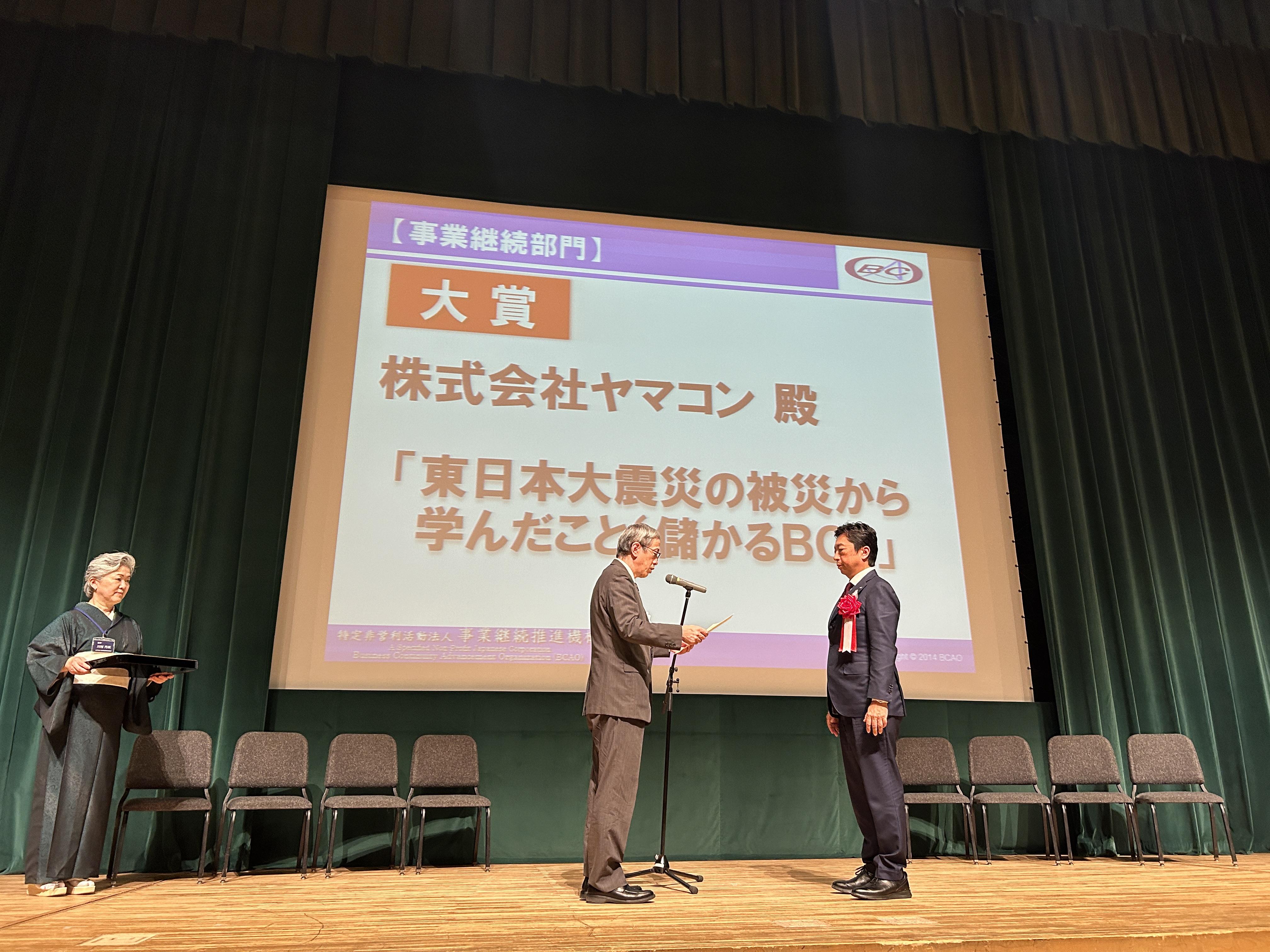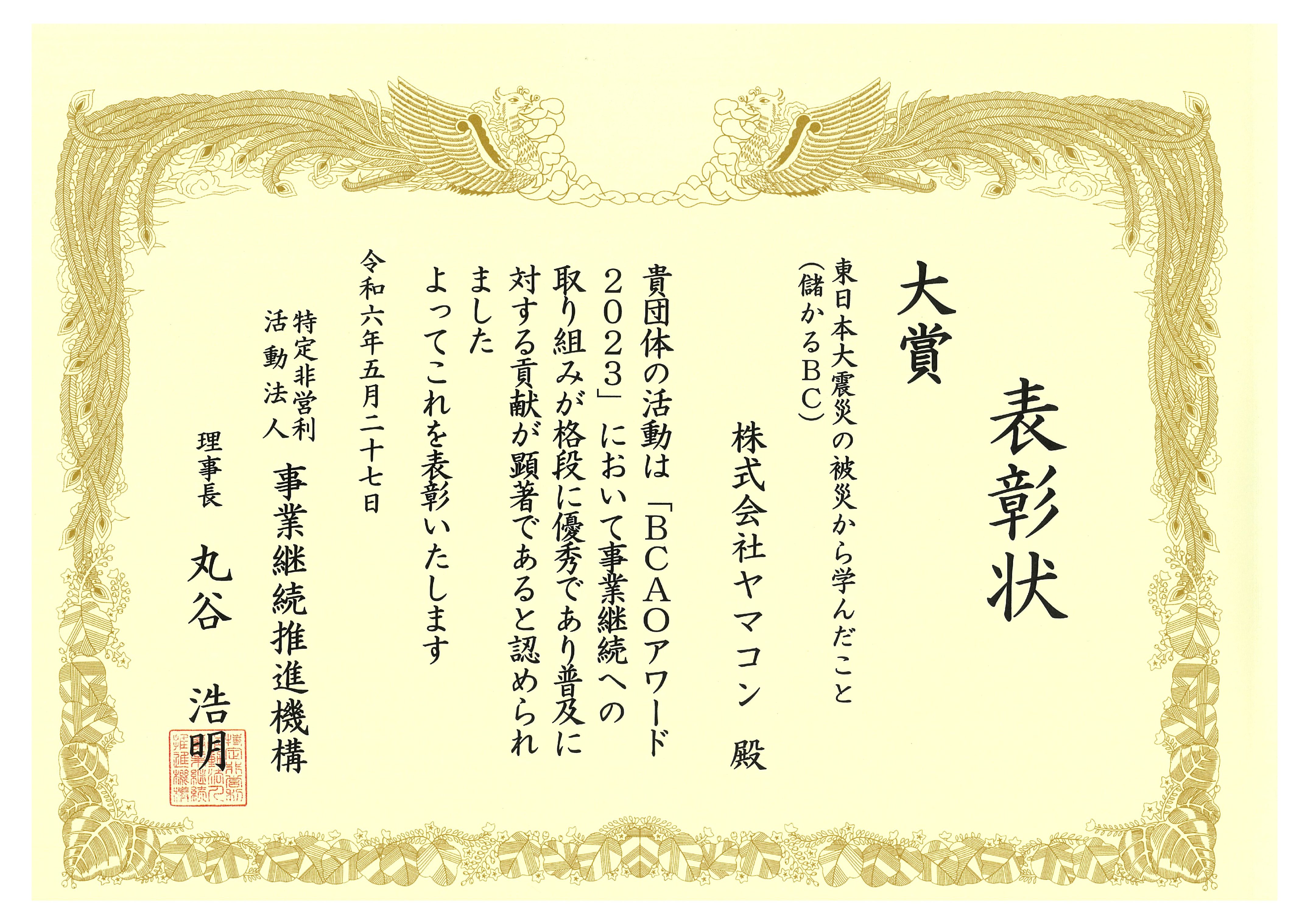 BCAO(特定非営利活動法人 事業継続推進機構)より「事業継続部門」において、人材育成や災害対策など多面的な事業継続(BC)の取組、それらが自社の業務の効率や経営体質の改善につながっていることも認められ、「東日本大震災の被災から学んだこと(儲かるBC)」につながる取組みとして高く評価されました。