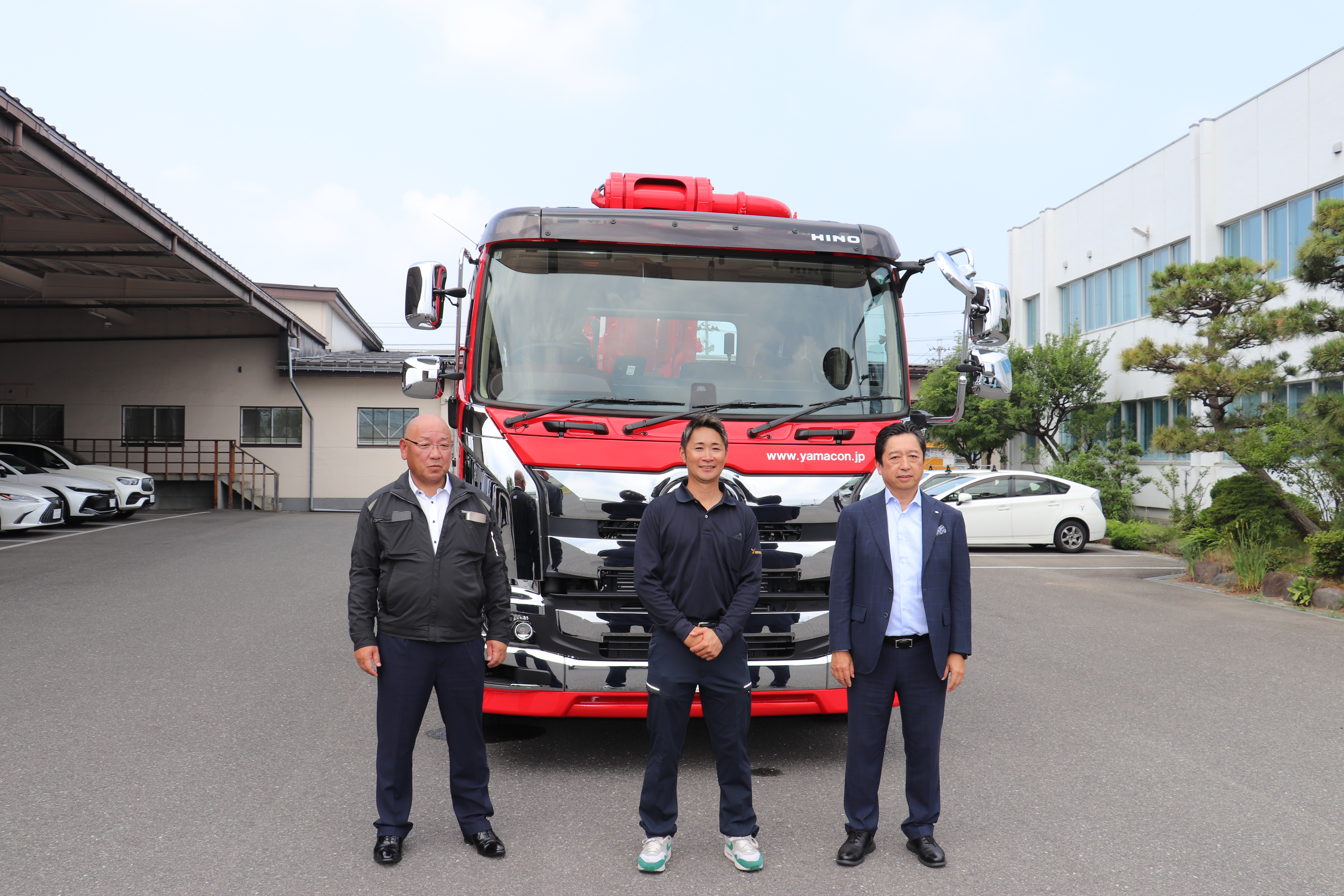 令和7年7月9日(水)極東開発工業26mブームのコンクリートポンプ車を納車しました。その際ヤマコン本社にて極東開発工業様より創立70周年の記念品を贈呈されました。コンクリートポンプ車は安全祈願を行い仙台支店で活躍いたします。