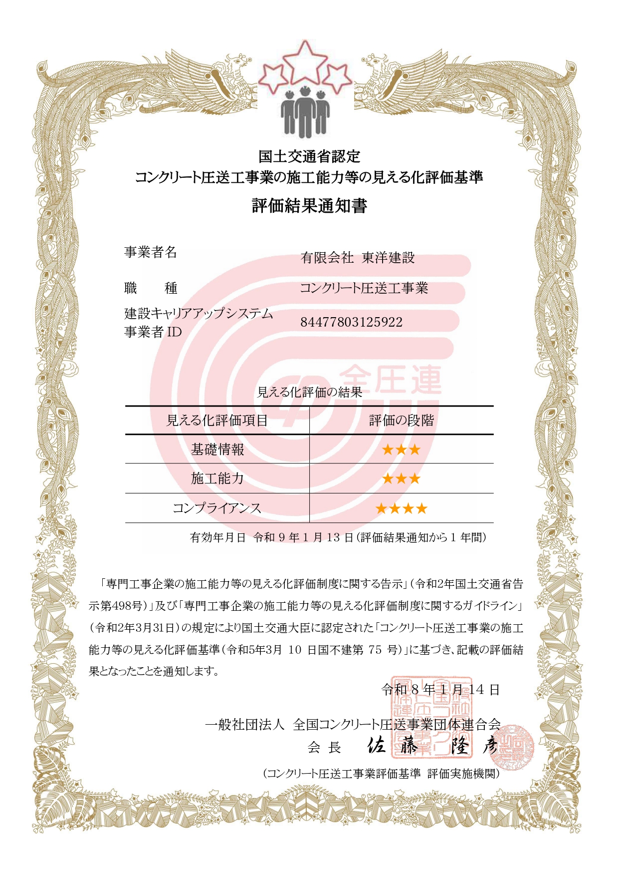 国土交通省が認定する「コンクリート圧送工事業の施工能力等の見える化評価」にて、ヤマコングループは高い評価を得ております。(最高評価☆4)