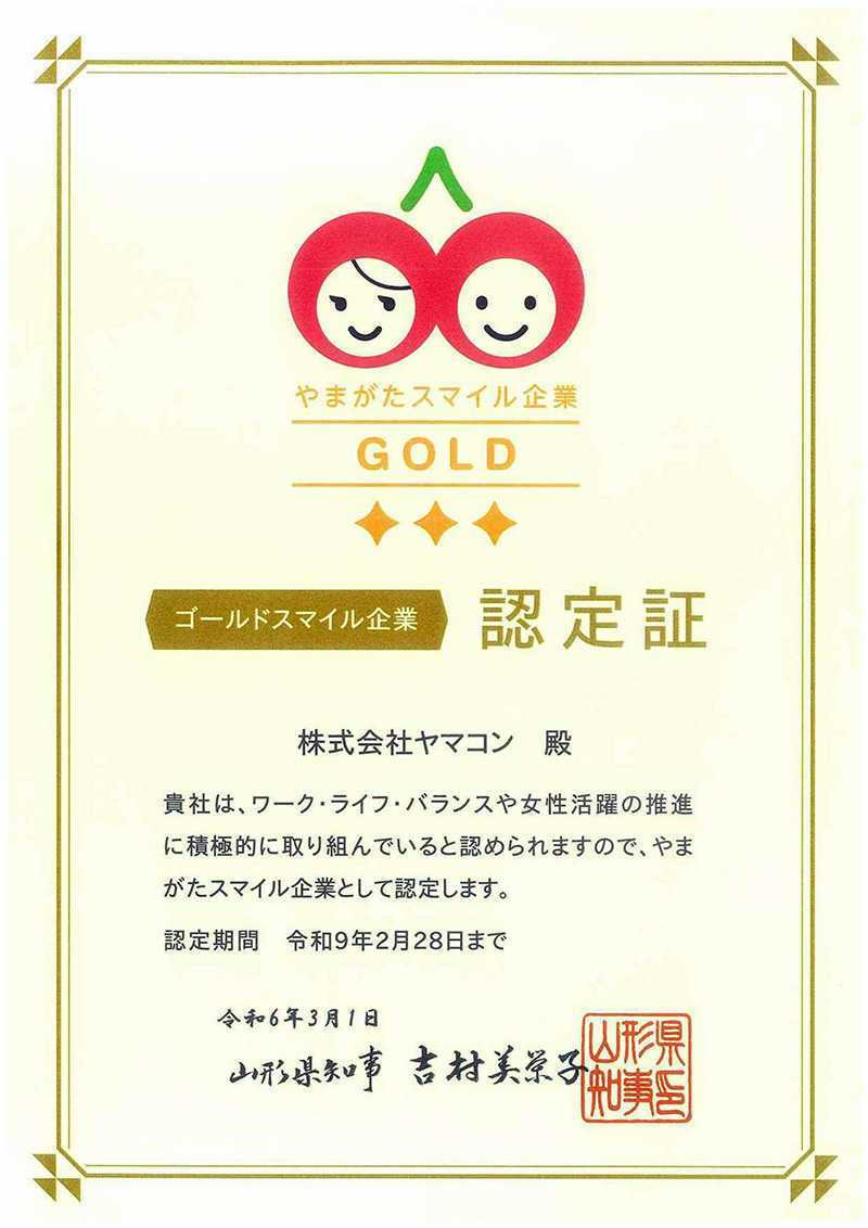 ワーク・ライフ・バランスや女性活躍の推進に積極的に取り組んでいるとして、ゴールドスマイル企業に認定されました。